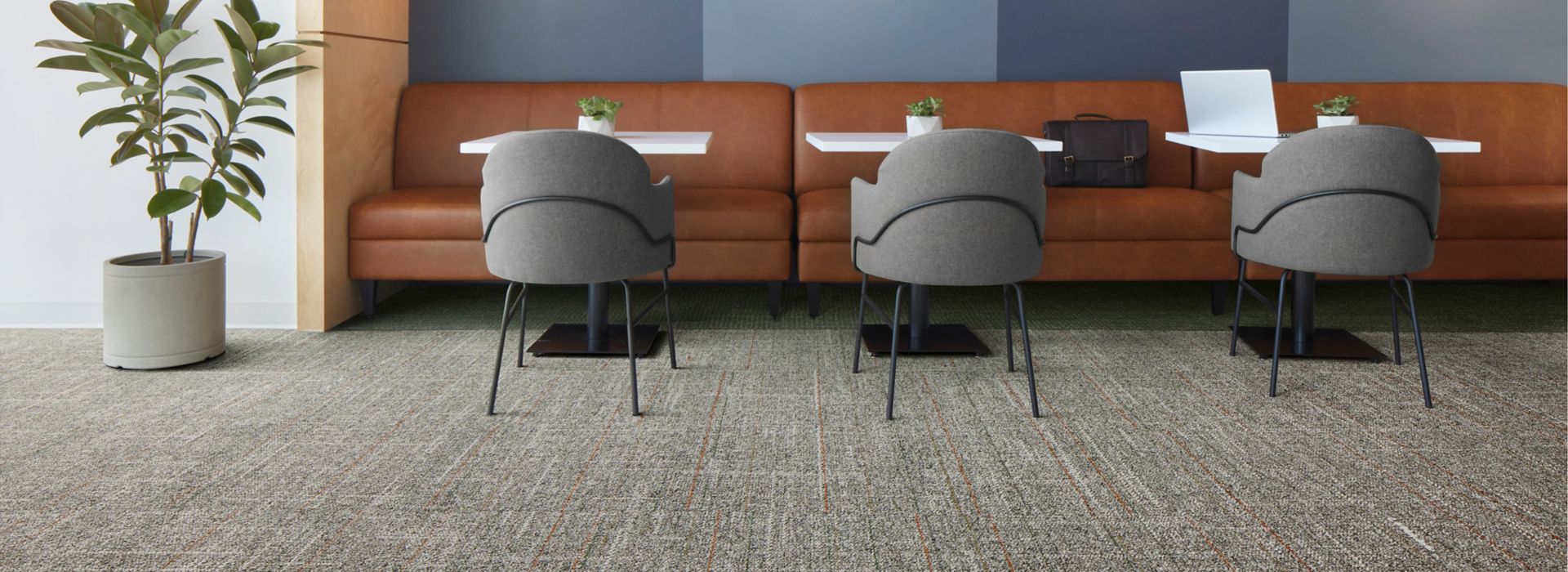 Open Ended is a sophisticated near-solid carpet tile that makes interior spaces more vibrant while being more practical and forgiving than solid colors. The colorways of Open Ended directly coordinate with the accent stripes in Open Air Stria carpet tile.